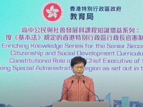 行政长官林郑月娥今日下午向高中公民与社会发展科教师授课,主题是“按基本法规定的香港特别行政区行政长官宪制地位”。教育局局长杨润雄、副秘书长康陈翠华等人都有出席课堂;课堂同时经网上及电视直播。 林郑月娥表示,香港自古以来是中国一部分,因为三条不平等条约而成为殖民地;而中华人民共和国在上世纪恢复联合国合法席位后,就提出将香港及澳门由殖民地的名单剔除,获联合国大比数通过。 林郑月娥又指,事件反映国家在50年前对主权问题已是非常坚定,因此不难理解为何当有人鼓吹国家分裂、民族自决、香港独立时,会引来全国人民反弹。 回归以来已三次推动政改 林郑月娥批评,近年很多所谓追求民主的人士指,行政长官不是由一人一票产生,是中央政府亏欠港人,她认为有关概念是错误,因为根据基本法第45条,行政长官是在本港通过选举或协商产生,而且特区政府在回归以来,经已三次推动政改;她又指2014年讨论政改时,有人提出以“公民提名”产生行政长官候选人,是违反基本法第45条规定。 林郑月娥说,以行政长官为首的行政主导体制,不是新创,香港回归前的首长一直都是港督,但亦从来没有选举或谘询过港人。她又表示,不想特别批评过去的通识教育科,强调新设的公民科是要让学生更掌握三个核心元素,包括国家近代发展、“一国两制”下的香港,以及国际形势,否则学生未来的竞争力会受损。 林郑月娥又说,受到社交媒体等因素影响,新一代慢慢不重视一些中国人的家教及美德,令她感到忧虑,认为“做人要有一些底线”,因此期望教师可以多加着重培育学生。 林郑月娥早前在立法会宣读任内最后一份施政报告时曾表示,为了让公民科教师掌握行政长官在“一国两制”下的宪制地位和职权,她会亲自为有兴趣的老师上一堂课。