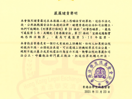 香港法学交流基金会:严厉谴责恐吓法官罪犯