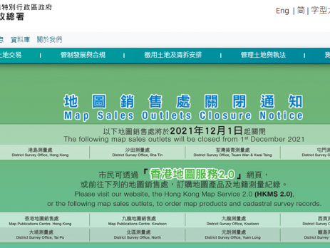 地政总署今日(23日)宣布,由12月1日起关闭4个分别位于湾仔修顿中心、沙田政府合署、屯门政府合署和荃湾政府合署的地图销售处。 市民可透过「香港地图服务2.0」或于地政总署另外8个地图销售处订购地图产品及地籍测量纪录。余下8个地图销售处分别位于北角政府合署、西九龙政府合署、西贡政府合署、大埔政府合署、北区政府合署、元朗政府合署,海港政府大楼以及弥敦道382号。
