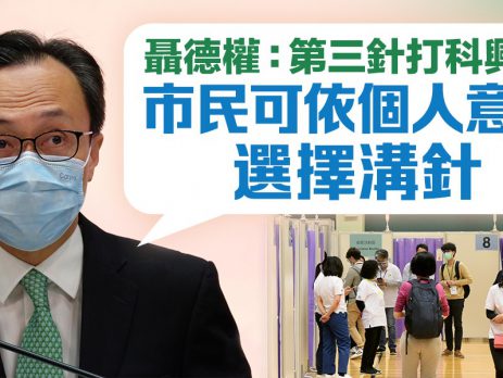 政府今日起为指定群组,包括免疫力弱及有较高风险人士等接种第三针新冠疫苗。行政长官林郑月娥今早到北角渣华道体育馆的疫苗接种中心,接种第三针科兴疫苗。公务员事务局局长聂德权和食物及衞生局局长陈肇始亦有到场。 聂德权表示,21间疫苗接种中心有足够能力应付市民打针的需求,会视乎指定群组的接种情况,尽快开放让已接种两剂科兴疫苗,而第二剂已接种超过六个月的人,接种第三针。 聂德权又指,自己头两针都是打科兴,因此较喜欢灭活疫苗的平台,第三针也选择了科兴。 对于林郑月娥日前表示,自己会继续接种科兴,又指抗体水平“不是越高越巴闭”,聂德权说,相关资讯已经很清楚,目前两款疫苗都是安全有效,抗体水平虽然有分别,但预防重症和死亡的保护力相若,市民可以按自身情况和意愿,选择哪一款疫苗。 政府正分阶段展开接种第三针疫苗计划,特定群组由今日起可免费打第三针,包括免疫力弱人士,例如癌症病人、器官移植病人、晚期爱滋病患者、需服药压制免疫系统的人士等,他们打第二针后最少四星期打第三针;较高感染风险人士,例如60岁或以上长者、医护人员、长期病患者、工作环境有较高暴露/传播风险的员工,他们打第二针后最少六个月打第三针。