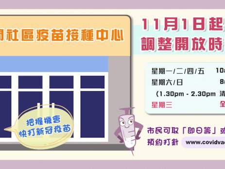 新冠疫苗接种持续放缓,疫苗接种中心本月起缩减服务时间,并逢周三全日休息,即今日(3日)不设打针服务。 香港政府早前表示,由11月1日起,社区疫苗接种中心由26间减至21间,服务时间亦有调整,周一至五服务时间为上午10时至下午6时,逢周三全日休息,周六及日则上午8时至晚上8时提供服务。 香港政府指,市民可取“即日筹”即场接种新冠疫苗(设于私家医院的接种中心除外),或于网上预约接种科兴或复必泰疫苗,又呼吁尚未接种疫苗的市民应把握时间尽快接种,保护自己和家人。 其他接种途径: 科兴疫苗 - 医管局马鞍山家庭医学中心和天水围(天业路)社区健康中心(须预约) - 参与计划的私家医生和诊所 复必泰疫苗 - 设于7间公立医院的新冠疫苗接种站(无须预约)