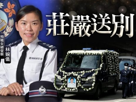 获封「走私克星」的水警总区女总督察林婉仪,9月25日在沙洲对开执勤期间不幸殉职,警队今日(2日)在红磡世界殡仪馆举行最高荣誉丧礼仪式。 丧礼于今晨9时半开始,首先在地下灵堂举行传统悼念仪式,供亲友、政府官员参加。早上9时许,海关关长何珮珊、惩教署署长胡英明、政制及内地事务局局长曾国卫、公务员事务局局长聂德权等官员及警务处处长萧泽颐陆续抵达殡仪馆。官方仪式随后于10时半举行,灵堂内及殡仪馆外将会举行警队丧礼。 早上11时,众人列队在殡仪馆外向林作最后致敬。丧礼完毕后,送殡行列会前往昂船洲政府船坞水警小艇分区总部进行路祭,再到和合石浩园举行安葬仪式。安葬仪式约于中午12时40分在浩园举行,现场气氛庄严,数十名亲友及同袍作最后送别,林从此长埋黄土。