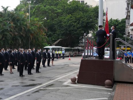 今日(10月1日)是国庆节,中央驻港国安公署举行升旗仪式,庆祝中华人民共和国成立72周年。 驻港国安公署署长郑雁雄及多名人员肃立,升旗手将国旗升起,全体人员面向国旗行注目礼,齐声高唱国歌,祝愿祖国繁荣昌盛,香港明天更美好。 在场人员肃立,面向国旗行注目礼。