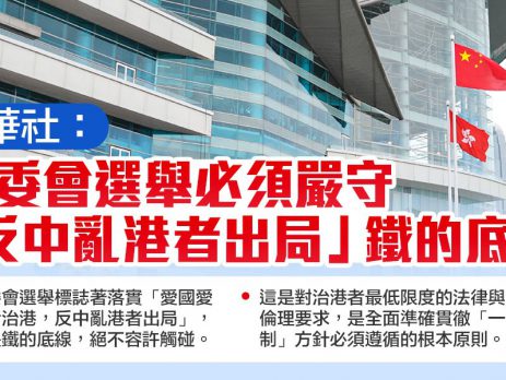 新华社今日(18日)发表文章,表示明日举行的选委会界别分组一般选举,是香港新选举制度正式落地后举行的首场重要选举,标志着落实「爱国爱港者治港,反中乱港者出局」,认为这是铁的底线,绝不容许触碰。 文章认为,选举安全是事关国家主权、安全、发展利益和香港繁荣稳定的大是大非问题,进入特别行政区管治架构的人,必须是爱国爱港者,绝不容许任何一个反中乱港分子,通过任何途径和方式混进特别行政区管治架构,变成管治者。这个绝非高标准、高要求,而是对治港者最低限度的法律与政治伦理要求,是全面准确贯彻「一国两制」方针必须遵循的根本原则。 文章认为,只有严格守住「反中乱港者出局」这条铁的底线,确保香港特别行政区的管治权牢牢掌握在爱国爱港者手中,香港才有可能进一步完成由治及兴的关键转变,最终实现良政善治。