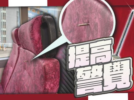 坐巴士小心「笃背脊」!昨晚(15日)约6时,一名女子乘搭九巴13M路线期间,赫然发现上层右边近车尾一张座椅的椅背,插着一颗露出尖嘴的螺丝钉,担心有乘客未有留意而坐下,恐遭螺丝钉刺伤,遂通知姓罗(25岁)车长处理。车长得悉事件后,安排乘客转乘其他车辆,并将该巴士驶回九龙湾车厂,然后报警处理。 警方到车厂调查,将长约8厘米的螺丝钉拔出,并带走调查。事件中无人受伤,列作财物损毁。九巴发言人表示,九巴会配合有关调查,并感谢有关乘客举报。 2018年九巴接连有巴士座椅被插针,当年自6月27日至7月初,警方共接获9宗在巴士座位上发现利针的案件,当中5宗涉及缝纫针、3宗为针灸用针及1宗为大头针,导致3名女乘客臀部及腿部受伤。警方拘捕一名姓莫(30岁)无业汉,调查显示他至少与3宗案件有关。莫亦承认两项有意图而企图伤人罪及两项刑事毁坏罪,被判囚24个月。莫求情时声称案发前因赶巴士而与巴士车长争执,并遭车长以粗口回应,莫回话时又被乘客责骂,一时郁闷而忽发奇想犯案。 虽然刺客遭判刑,惟九巴座椅被插针仍不时发生。2020年1月23日晚,一名姓宋(47岁)妇人在乘搭双层九巴69M路线,遭一支约5厘米长利针刺伤腰部。2019年6月4日上午,一名女子搭乘机场龙运巴士坐于上层座位,向前伸脚时遭藏在前面座椅的一支约10厘米长针筒拮伤。