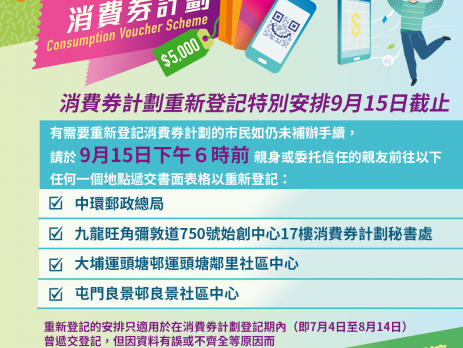 政府提醒,因资料有误或不齐全等原因而须以书面表格重新登记消费券计划的市民,如仍未补办手续,紧记今日(15日)下午6时前递交书面表格以重新登记。经核实符合资格后,登记人会在10月1日获发放第一期2000元消费券。 政府强调,重新登记的安排只适用于在消费券计划登记期内(即7月4日至8月14日)曾递交登记,但因资料有误或不齐全等原因而致有关登记未获进一步处理的人士。 有关市民可亲身或委托信任的亲友前往以下任何一个地点递交书面表格以重新登记,4个地点会提供服务至今日下午6时: - 九龙旺角弥敦道750号始创中心17楼的消费券计划秘书处 - 中环邮政总局 - 大埔运头塘村运头塘邻里社区中心 - 屯门良景村良景社区中心