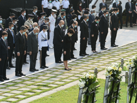 今日(3日)是中国人民抗日战争胜利纪念日,本港今早在香港大会堂纪念花园举行纪念仪式,行政长官#林郑月娥# 与出席人士于早上近8时,陆续到场。 现场先进行升国旗、奏国歌,之后由警察步枪仪仗队鸣枪21响,向抗战胜利作出贡献的英烈致敬,出席仪式的全体人士默哀两分钟。林郑随后携各界别代表,包括中央驻港机构、司法机构、政府机构、行政会议及立法会、人大政协等,在纪念龛前向英烈鞠躬。 整个仪式历时大约10分钟,出席者包括全国政协副主席梁振英、前行政长官曾荫权、终审法院首席法官张举能及三名司长等。