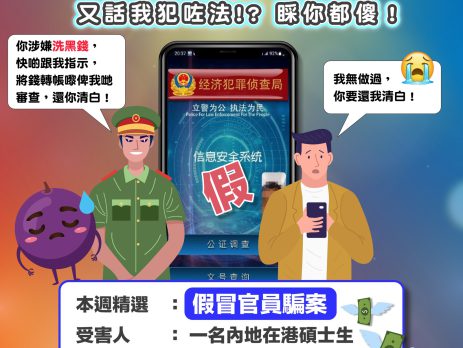 香港警方昨日(7日)表示,一个内地在港硕士生,收到假冒卫生署职员来电,指控其涉嫌干犯《公众卫生及市政条例》,再将电话「接驳」至自称内地公安人员进行「资产审查」调查。 受害人不疑有诈,听从骗徒指示,先去一个「经济犯罪侦查局信息安全系统」填写自己网上银行登入资料,再按照要求将约150万人民币转账至指定户口。其后骗徒再叫受害人过数,受害人登入网上银行,发现已经有约61万人民币被转走,而骗徒消失无踪。 警方提醒,假冒官员骗案常见套路为先收电话「指控」你违反《公众卫生及市政条例》,再「屈」你经济犯罪。如收到可疑电话,可第一时间致电「防骗易18222」热线查询。