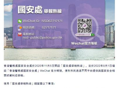 警务处国安处今日(8月1日)启用微信公众号,市民可作举报。市民可在微信搜寻「香港警务处国家安全处」,关注官方帐号,获取国家安全资讯。相关帐号并设有举报功能,市民可直接提供或举报与国家安全相关的资料。平台不设回覆,也不适用于一般报案或非国家安全案件。
