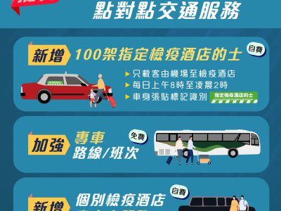 随着从外地抵港人数增多,由香港国际机场前往指定检疫酒店的点对点交通服务需求亦有所上升。政府发言人今日(25日)表示,政府已提升现有的免费点对点交通服务,并新增自费点对点交通服务,供抵港人士选用,以期缩短由机场前往指定检疫酒店的时间。 (一)免费点对点指定交通服务 医务卫生局已要求指定交通服务营运商按指定检疫酒店的数目及分布、抵港人士的数量等,适当调整专车服务的班次和路线,提升运送率。由于指定检疫酒店的数目在过去四个月倍增至接近七十间,医务卫生局自七月初开始,已将由机场前往指定检疫酒店的免费指定交通服务路线增加至十八条,每条路线途经三至五间酒店不等,各个车程均不会超过两小时。另一方面,机场入境大堂所有指定交通服务路线均有清晰的指示牌,显示该路线所前往的指定检疫酒店。 (二)自费指定检疫酒店的士服务 经运输及物流局协调,的士业界以试办形式安排一百辆的士由今日起为抵港人士提供由机场前往指定检疫酒店的接载服务。乘客须自费使用指定检疫酒店的士服务,按表缴付车费及其他适用的附加费,例如隧道及行李费。指定检疫酒店的士的服务时间为每日早上八时至翌日凌晨二时。如抵港人士有意自费乘搭的士前往检疫酒店,可在完成入境手续及认领行李后,通知入境大堂的工作人员,并按指示前往乘搭指定检疫酒店的士的位置候车及上车。 指定检疫酒店的士只会接载抵港人士由机场前往指定检疫酒店,不会接载乘客往其他地方或接载其他乘客。 (三)自费指定检疫酒店贵宾专车服务 现时约有十间指定检疫酒店安排自费的贵宾专车服务。来港人士可提前向其酒店查询。政府已为指定检疫酒店的士营办商、提供贵宾专车服务的指定检疫酒店和司机提供防疫抗疫指引,司机须穿上防疫装备,包括口罩、防护衣等,并须在完成每程后彻底清洁和消毒车辆。