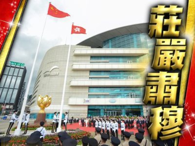 湾仔金紫荆广场今早(7月1日)8时举行香港回归25周年升旗礼,即将宣誓就任香港第六届政府行政长官的李家超,以及一众政府高层官员出席,国家主席习近平及夫人彭丽媛则未有到场,但会出席稍后的就职典礼。另今年是连续第3年不设公众观礼区。升旗仪式开始时,警察银乐队先奏响乐曲,纪律部队仪仗队和步操队,包括共有27人的护旗方队,均以中式步操进场,并由歌唱家领唱国歌,其后徐徐升起五星旗及区旗,而悬挂着国旗和区旗的特区政府飞行服务队直升机飞过维多利亚港上空,消防处灭火轮在维港海面喷洒水柱敬礼,纪律部队的船只就在海港致敬。升旗仪式结束后,特区政府会在会展3楼大会堂举行香港回归25周年大会暨香港特别行政区第六届政府就职典礼。典礼开始前,警察银乐队和入境事务处乐队分别于举行典礼的大会堂及展览厅演奏。其中入境处乐队派出银乐队约30名乐手和鼓手,演奏多首中港名曲暖场,包括东方之珠以及由入境处乐队改编的特区成立25周年主题曲“前”,令现场气氛更加炽热,为迎接典礼作好准备。