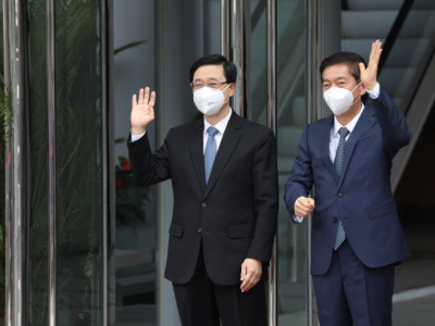 第六届行政长官选举于昨日(8日)顺利举行,候选人李家超获得1416张支持票,高票当选第六任行政长官人选。当选翌日(9日),李家超即马不停蹄开始拜会各界,包括今日下午拜访4个中央驻港机构,第一站是香港中联办。李家超于下午3时正乘坐车牌AM1的车辆抵达中联办,中联办主任骆惠宁在中联办大门迎接,并向在场媒体挥手致意。 李家超下车走进中联办大楼,中联办副主任陈冬、秘书长王松苗先上前迎接,互相以碰臂方式打招呼。李家超再走到骆主任面前,两人先行恭手礼,再互相碰臂,并一起向传媒挥手。 至下午约3时半,李家超由副主任陈冬送行到大楼门外上车离开,继续拜访驻港国安公署、外交部驻港特派员公署,以及解放军驻港部队的行程。