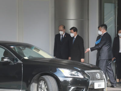 第六届行政长官选举于昨日(8日)顺利举行,候选人李家超获得1416张支持票,高票当选第六任行政长官人选。李家超今日(9日)下午4时,前往铜锣湾中央驻港国安公署作礼节性拜会,约半小时后离开。中央驻港国安公署署长郑雁雄、副署长李江舟及孙青野等陪伴李家超离开,李家超登车前热情地与大家碰手。