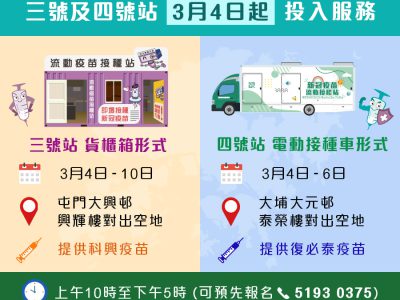 香港疫情严峻,为加快替市民接种新冠疫苗,政府今日(4日)起增加2个流动接种站,走访多个屋村,并到学校提供外展服务,方便市民和学生打针。 3号站以货柜箱形式运作,3月份会先后到访屯门、大埔及天水围,提供科兴疫苗。4号站以电动接种车形式运作,首站到访大埔后,会到多间学校为学生接种复必泰疫苗。 政府指,2个流动站启用后,流动站的数目将增至4个,希望市民把握机会接种疫苗,特别是长者和学童,加强自身保护。