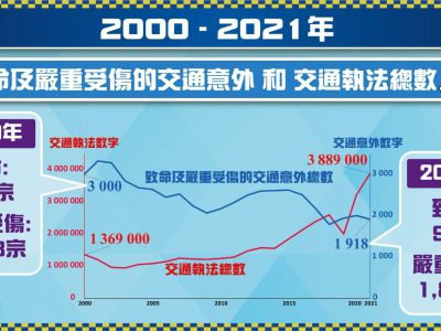 香港警方今日(28日)在社交媒体公布2000至2021年致命及严重受伤交通意外和交通执法总结。2021年全年一共发生94宗致命交通意外,并有97人在意外中不幸去世,数字为1954年以来最低。此外,致命及严重受伤的交通意外数字由2000年的3000宗,每年平均减少2%,下跌至2021年的1918宗;相比2020年的2008宗,下跌约4.5%。 警方表示,多年来不断加强交通执法力度,交通执法数字由2000年接近140万,平均每年递增5%,增加至2021年接近390万。而2021年对比2020约320万的执法数字,更大幅增加20%。警方近年引入新的执法工具,例如电子告票及快速口腔液测试等,大大提高执法成效及阻吓性,亦展示出警方打击与交通相关罪行的决心。