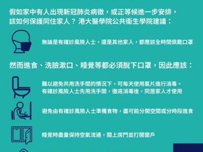 本港第五波疫情大爆发,确诊数字连日倍数增长,医疗系统压力剧增,不少怀疑染疫人士只能在家中等候政府进一步安排,同时担心自己会传染给同住家人。港大医学院公共卫生学院今日(15日)提出建议,表示假如家中有人出现病征,又或者正在等候进一步的安排,可以采取五项措施,包括怀疑染疫人士及同住家人都应该全时间佩戴口罩。 居家抗疫可以采取以下五项措施: 一、无论是有确诊风险人士,还是其他家人,都应该全时间佩戴口罩;(吃饭、洗脸漱口、睡觉脱下口罩时应采取以下措施) 二、难以避免共用洗手间的情况下,可每天使用氯片进行消毒。有确诊风险人士先用洗手间,彻底消毒后,同居家人才使用; 三、避免由有确诊风险人士准备食物,尽可能分开空间或分时段进食; 四、睡觉时尽量保持空气流通,关上房门并打开窗户; 五、可考虑准备探热针及血氧测量仪,以随时观察健康状况,并在有需要时向医疗机构求助。