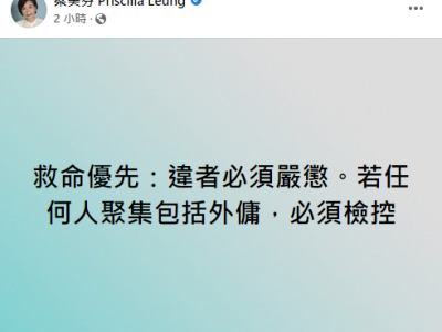 本港第5波疫情严峻。立法会议员梁美芬今日(15日)于社交媒体发文指出,政策应以「救命」优先,并需严惩违法人士。 梁美芬表示,政策应以「救命」优先,扩建方舱医院救治感染者刻不容缓,并呼吁政府协调非政府组织、政府的空置校舍以及宗教团体开放空置场地,让确诊病人接受隔离。 她指出,必须严惩违法人士。若执法人员发现有任何人聚集,包括外佣等,亦必须检控。她形容,「抗疫就是一场战争,一定要滴水不漏对抗敌人」。