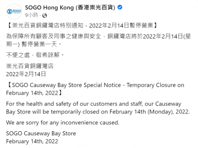 崇光百货今日(14日)凌晨在社交网站Facebook发通告,指铜锣湾店今日暂停营业一天,惟未有详细交代原因。 崇光百货表示,为保障所有顾客及同事之健康与安全,崇光百货铜锣湾店于今日(14日)暂停营业一天。 崇光百货铜锣湾店月初曾因有员工初步确诊,在2月5日及6日暂停营业,并安排全店的深度清洁及雾化消毒工作,包括所有设施和设备、各楼层空间等,同事亦需即时进行新型冠状病毒核酸测试。