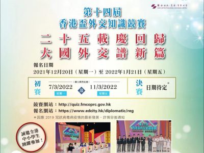 由外交部驻港公署、特区政府教育局、香港明天更好基金共同主办,上海复旦大学,香港大公文汇传媒集团等协办的2022年第十四届「香港杯」外交知识竞赛报名正式开始报名,截至上周三(19日),已经有63间中学、79间小学,共30020名学生报名,今次主题为「二十五载庆回归,大国外交谱新篇」,不少学校已紧密筹备在3月7日及3月11日举行的初赛。决赛时间待定。 今届竞赛以「二十五载庆回归,大国外交谱新篇」作主题,配合今年香港回归祖国二十五周年盛事,各间学校由即日起到2月11日可到香港教育城「少年Teen空」平台报名,亦可关注外交部公署网站留意最新报名资讯。比赛以普通话进行,有小学组及中学组,主办方将提供由外交部驻港公署及外交学院编著的《中国外交知识读本》(更新版),并特别准备另外8篇参考文章,供学生阅读。公署外交官又会向参赛师生讲解新时代中国特色大国外交、「一带一路」、改革开放、《基本法》与「一国两制」等专题。 小学组只有一轮网上问答比赛,不设决赛,有冠、亚、季军及优异奖,中学组分初赛及决赛,而决赛则有排名前五的精英赛,以及排名第六至第十的先锋赛,比赛可能将在电视台进行及录制成电视节目。 主办方指出,胜出同学不仅可获奖状、奖杯,更有机会得到飞机模型、平板电脑、书券和主题乐园门票等奖品。往届的比赛中,获奖师生代表都曾经赴北京等内地城市参访,包括走访外交部,秦刚、华春莹等知名外交官都曾经面对面回答获奖同学提问,机会难得。