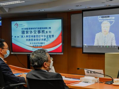 公务员学院今日(27日)与外交部驻香港特别行政区特派员公署(以下简称「公署」)举办首场「国家外交事务系列」讲座,由外交部政策规划司司长苗得雨透过视像形式主讲,主题为「深入学习领会习近平外交思想,共创香港美好未来」。公署副特派员杨义瑞亦出席是次讲座。约220名首长级和高级公务员通过网络参与今日的讲座。 公务员事务局局长聂德权在讲座上致辞时表示,在新时代的宏观环境下,香港特别行政区政府公务员,尤其是高级官员,十分有需要加深了解国家发展策略与世界格局变化,提升国际视野及敏感度,在自己的岗位上,更好配合特区政府全面落实「爱国者治港」原则,推进「一国两制」实践行稳致远,使香港在国家的发展大局中发挥应有的、更大的作用。 聂德权说,公务员学院会透过不同的培训巩固公务员的国家观念和加深同事的大局意识,当中包括加强与公署合作,每月主办一场「国家外交事务系列」讲座,由外交部的相关司局负责人主讲,内容涵盖不同主题,加深公务员对国际形势以及国家处理外交事务的了解,从而在工作上更好地配合国家的外交政策。