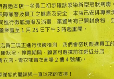 青衣长亨商场惠康今日(25日)有一名员工初步确诊。据该店贴出的告示,指得悉一名员工初确,惠康已安排彻底清洁及消毒,同时弃置所有已开封食物,该店会暂停营业至今日下午3时重开。 本港昨日(24日)新增109宗确诊个案,其中葵涌村逸葵楼增27宗,村内已逾200宗病例,染疫大厦目增至11幢。