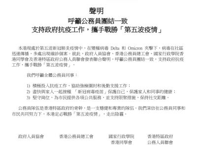 四个公务员工会今日(24日)发表联合声明,呼吁公务员团结一致,坚守岗位,尽快接种疫苗,支持政府抗疫工作,携手战胜「第五波疫情」。 参与声明的工会包括政府人员协会、香港公务员总工会、国家行政学院香港同学会及香港特区政府公务人员联会。发言人表示,香港现处于第五波新冠肺炎疫情,变种病毒Delta 和Omicron 夹击下,病毒在社区迅速传播,多处出现确诊个案。工会呼吁全体公务员同事,积极投入抗疫工作,协助强检围封和后勤支援工作;尽快与家人一起接种「新冠病毒疫苖」保护自己,保护家人和同事的健康;坚守岗位,为市民提供各项公共服务,并支持限聚措施,保持社交距离。 发言人表示,公务员队伍是香港特区政府的骨干,是一支稳健和专业的队伍,深信在公务员同事和市民共同努力下,定必战胜「第五波疫情」,走出阴霾。