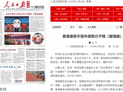 《人民日报》海外版今日(24日)发表评论员文章再次强调,香港事务不容外部势力干预。 文章表示,欧洲议会近日通过所谓涉港决议,对香港的法治、自由和人权状况横加指责,批评欧洲一些政客常以高高在上的「民主教师爷」自居,摆出一副「为香港好」的伪善模样,实际上是从意识形态偏见和政治利益出发,无视香港的真实情况。 文章表示,香港营商环境明显改善,经济复苏强劲;在修改完善的选举制度下,去除「泛政治化」,杜绝「港独」「反中」政治秀,回归专业和理性。 文章认为,香港越好,欧洲一些政客越着急,是因为他们从根本上就站在香港利益对立面。中欧合作发展是大势所趋,香港的繁荣稳定也关系到超过2300家欧盟在港企业和35万在港欧盟公民的利益。香港的繁荣稳定源自祖国支持和自身奋斗,无须那些别有用心的外国政客操心,敦促欧洲议会恪守国际法和国际关系基本准则,停止干涉中国内政、干预香港事务,改一改充当「民主教师爷」的老毛病。