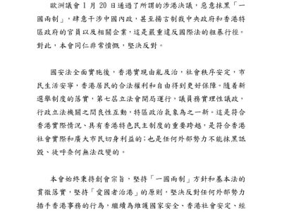 、 欧洲议会前日(20日)通过了所谓的涉港决议,恶意抹黑「一国两制」,肆意干涉中国内政,甚至扬言制裁中央政府和香港特区政府的官员以及相关企业,这是严重违反国际法的粗暴行径。对此,香港友好协进会表示非常愤慨,坚决反对。 香港友好协进会指出,国安法全面实施后,香港实现由乱及治,社会秩序安定,市民生活安宁,香港居民的合法权利和自由得到更好保障。随着新选举制度的落实,第七届立法会开局运行,议员务实理性议政,行政立法机关之间良性互动,特区政治气象为之一新。这是符合香港实际情况、具有香港特色民主制度的重要跨越,是符合香港社会实际和广大市民切身利益的;也是任何外部势力不能抹黑诋毁、徒呼奈何无法改变的。 香港友好协进会强调,本会始终秉持创会宗旨,坚持「一国两制」方针和基本法的贯彻落实,坚持「爱国者治港」的原则,坚决反对任何外部势力插手香港事务的行为,继续为维护国家安全、香港社会安定、经济民生发展,确保「一国两制」实践行稳致远,做出我们不懈的努力。