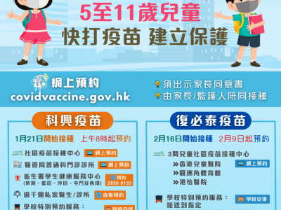 新冠肺炎变异病毒株传播力强,政府大力呼吁市民接种新冠疫苗加强保护。而本港5至11岁的儿童,由今日(21日)起可以接种科兴疫苗,并已于今早8时起提供网上预约;至于复必泰疫苗则由2月9日起预约,2月16日开始接种。 儿童必须在接种疫苗当日携同已签妥的家长同意书,并由家长/监护人亲自陪同前往接种疫苗。而儿童与成人一样,接种第一剂与第二剂科兴疫苗需要相隔28日。而在预约接种新冠疫苗前,要特别留意接种新冠疫苗和其他疫苗(包括季节性流感疫苗)之间须相隔最少14日。