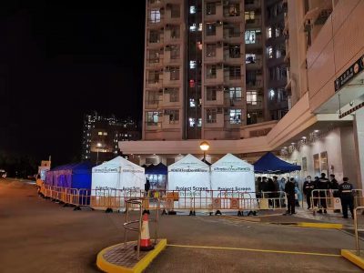 Omicron变种病毒杀入社区,本港爆发多条传播链。政府昨晚(12日)连封两座大厦进行强制检测,分别是油塘崇山街8号曦台1座及香港仔石排湾村碧朗楼,目标是在今早(13日)完成围封强检行动。两座大厦均有初步阳性检测个案居住,且初步显示都涉及变异病毒株,政府经评估后相关区域感染风险有机会较高,于今晚展开围封强检行动。 一名19岁就读邓镜波书院的6C班男学生今日初步确诊,住油塘崇山街曦台,未接种新冠疫苗,最后一天返校是上周五(7日),近日有去过中央图书馆,患者非同住家人早前确诊(个案12913),相信与先前个案相关。他11日出现病征,同日于社区检测中心抽取样本检测结果呈初步阳性,其Ct值少于30。政府昨晚7时起围封油塘崇山街8号曦台1座进行强制检测,目标是在明早约7时完成强检行动。 此外,一名居住在香港仔石排湾村碧朗楼的20岁港大学生今日初步确诊,曾接种两剂复必泰。他曾于1月4日到铜锣湾希慎广场「牛気」,属国泰空姐群组的生日宴确诊37岁女(个案12838)与菁英会秘书处32岁女职员(个案12882)亦曾于同一时段光顾该餐厅。卫生防护中心指,两人座位之间有另一台,怀疑大学生在餐厅受感染。该名大学生最后上学时间在去年12月中,亦分别在上环及湾仔的心事如尘茶食亭担任兼职工作,最后上班日期为1月6日。他于1月11日于社区检测中心抽取样本的检测结果呈初步阳性。他1月8日出现病征,Ct值少于30。当局怀疑食肆出现传播,相关部门会到铜锣湾希慎广场「牛気」视察,1月4日当晚曾在食肆逗留的人士要检测。他所居住的香港仔石排湾村碧朗楼自今晚7时起围封强检,目标是在明早约7时完成强检行动。 政府已经于「受限区域」内设立临时采样站,并要求受检人士于明日凌晨前接受检测。受检人士会获安排到采样站接受核酸测试,由专人以咽喉和鼻腔合并拭子采样。在所有人士有检测结果前,受检人士必须留在处所内,以减少交叉感染的风险。政府会为行动不便的人士和长者安排上门采样。