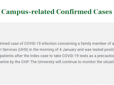 港大昨日(6日)公布,一名理学院教职员家人确诊新冠肺炎。该名确诊者曾于1月4日早上到访香港大学医疗保健处,昨日检测阳性。 校方已安排曾接触确诊者的保健处员工及之后接受诊症的2名病患接受检测。该名确诊者家人已被送往检疫中心。