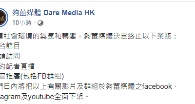 继《立场新闻》、《众新闻》、《癫狗日报》等媒体宣布停运之后,网媒「够姜媒体」今日(6日)于社交平台Facebook宣布终止部分业务,包括网台节目、街头访问、特约记者直播等,并会于日内将以上有关影片及群组于其Facebook、Instagram及YouTube全面下架。「够姜媒体」表示,其他业务包括市集举办、产品开发、广告合作等其他业务将继续。