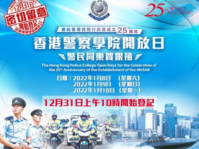 香港警方昨日(29日)在社交平台公布,为庆祝香港回归25周年,顺贺每年1月10日的中国人民警察节,警察学院将于明年1月8至10日期间举行开放日,与市民同乐。登记系统将由本周五(31日)至下月2日每日上午10时开放予公众登记各场门票,成功登记者将获电邮通知,并用二维码入场。 警方指,开放日节目丰富,分别有五个主题区域,其中主要的表演包括《警察大汇演》,市民可安坐大操场看台观赏升旗仪式及中式步操表演、警察乐队演奏、警犬表演、警队护送组驾驶技术示范及警队特别队伍的反恐演练。其他主题区域活动包括国家安全资讯展览、警队专业装备展示、亲子玩乐区、摊位游戏及精彩表演。