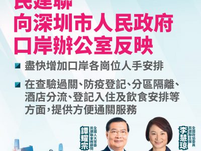 近日不少港人过关回内地,期望赶及在内地过农历新年,深圳湾口岸连日来出现排队人龙。全国人大常委会委员谭耀宗联同全国政协委员、民建联主席李慧琼,今日去信深圳市人民政府口岸办公室,希望深圳当局增加口岸人手安排,处理过关、防疫登记、酒店分流、饮食安排等。 两人在信中表示,年关将至,大批港人打算回内地过农历新年,为赶及完成21日检疫隔离期,近日赶着过关返乡,造成口岸区域出现大量人潮,经深圳湾口岸过关的港人,排队人龙在内地入境管制区已倒灌至香港出境管制区,在场等候过关人士最少要轮候至少6小时以上才能过关,不少人因长时间排队而疲累不堪。 两人又指,据悉,由于内地口岸边检人手不多,要严谨检查入境港人的核酸检测结果,加上在深圳一方要再接受采样检测,令过关时间大大延长,因此希望深圳当局能够及时处理。