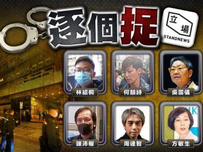 警务处国家安全处于今日(29日)拘捕《立场新闻》6名高层或前高层人员(3男3女),年龄介乎34岁至73岁,涉嫌违反《刑事罪行条例》第9及10条串谋发布煽动刊物罪,并搜查被捕人士的处所,各人随后被押往不同警署扣查。警方表示,执行由法院根据《港区国安法》第四十三条实施细则附表1发出的法庭手令,搜查观塘区一网媒公司办公室,搜查令包括授权警方搜查及检取新闻材料的权力,行动中共派出逾200名军装及便衣人员,搜查行动仍在进行中。 据了解,被捕6人为钟沛权、周达智、吴霭仪、方敏生、何韵诗、林绍桐,当中5人为前董事,其余1人为署任总编辑,涉嫌提供平台发布煽动性文章,违反《刑事罪行条例》第9及10条串谋煽动意图罪。据悉,林绍桐即时辞任署任总编辑一职。 国安处人员早上兵分多路,一批人员于早上6时许,持法庭手令掩至记协主席、《立场新闻》副采访主任陈朗升位于沙田显径村的寓所搜查。至早上7时半,警员把他押上七人车带走,七人车其后驶入大埔帝欣苑。据知,他未有被捕,只是协助调查。 陈朗升助查后获准离开,他表示警方早上到其显径村的住所搜屋约1小时,检走了电脑、手机、平板电脑等,其后再到其大埔「老家」搜查,检走了其记者证、存折及提款卡。陈提到自己十分担心林绍桐及钟沛权,并重申自己没有被捕,强调「立场新闻一向都系做专业的新闻报道,无论是什么东西、什么罪名都改变唔到事实」。 另一批人员则掩至《立场新闻》位于观塘开源道55号开联工业中心的办公室搜查。至早上8时20分,警员押林绍桐搜查观塘办公室。目前警方封锁办公室所在的14楼全层,立场职员出入要登记。警员及后由办公室带走多个放有证物的胶箱,放上货车准备运走。 今年6月《立场新闻》曾发出公告,《立场》母公司6位董事余家辉、周达智、吴霭仪、何韵诗、方敏生及练乙铮辞去董事职务,其余2位董事蔡东豪及钟沛权留任。至上月钟沛权宣布辞任《立场新闻》总编辑一职,由林绍桐署任。钟的妻子为前《苹果日报》副社长陈沛敏。