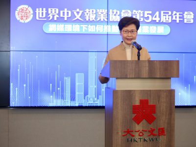 世界中文报业协会第54届年会于今日(18日)举行,受疫情影响主会场设在香港,通过视频连线的方式举行年会。香港特区行政长官林郑月娥、香港中联办副主任卢新宁及世界中文报业协会首席会长姜在忠等出席年会。林郑月娥在致辞时表示,报章及其他传媒在维护国家安全上都有重要角色,她重申香港国安法明确提出保障新闻自由。 林郑月娥说,本港的海内外媒体每天都在行使新闻自由,包括监察及批评政府施政,希望媒体同时自觉维护国家安全,并主动向社会传递有关国家安全的讯息。她强调,如果国家安全不获充分保障,新闻自由及各项权利自由亦失去基础,又指中文报章属政府发放讯息的重要途径,希望出席活动的传媒支持及指导政府工作。 林郑月娥指出,随着科技的发展,互联网及智能手机的普及,提高了资讯传播的速度,改变了大众的生活和工作模式,然而不论传播的速度或方式如何革新,资讯本身的内容才是最重要的,而这个也是新闻媒体的核心价值。她认为,高质素的新闻媒体不但能为读者或观众搜集及发掘资讯,还具备分析、解读、评论等功能,能让公众关心和了解社会的情况和重要的议题,促进良性讨论,推进社会变革和进步。基于新闻媒体这些重要的功能,林郑月娥认为,即使科技日新月异,新闻媒体的价值和存在的必要性始终如一。 林郑月娥又说,虽然新闻媒体的价值毋庸置疑,但科技十多年的发展和应用确实对新闻媒体,特别是报业的经营环境带来重大的变化和挑战。她指,现今很多人,尤其是年轻一代都少买报纸及看报,而是通过手机、网络及社交媒体取得资讯和看新闻。她说,根据调查,近年使用电子版看新闻的人数有明显增长,在2010年,印刷版的新闻报纸占据市场71.5%,网页版仅28.5%,当时手机版仍未出现,到2019年,相应的市场占有率已经变为印刷版40%,网页版25.3%,手机版34.7%。在不足十年时间,印刷版及电子版占据的份额出现了逆转,相信电子版所占的比重还有可能进一步增加。 林郑月娥认为,中文报业有需要因应时代的变化做出转型,而事实上大部分报章已做跨媒体的发展,除了出版实体的报纸,都会开拓网上版及应用程式版,也会在社交媒体发布消息,以吸引更多读者;业界今后仍要不断留意科技发展及读者习惯变化,不断探索如何在网络世界中扩大中文报业的影响力。 林郑月娥续说,虽然报纸发展受到前所未有的冲击,但报纸仍在读者市场占有重要份额,纸媒和网媒是可以并存,而且应该是互相补足,传播速度快的网媒比较适合发放短小、及时性的资讯,而传统的报纸可以作出更深入的分析、评论,引导读者思考和讨论重要的议题,帮助社会寻求及凝聚共识。 此外,林郑月娥说,网络的普及固然加快了资讯的流通,但也引起问题,如错误资讯和虚假消息的快速传播。她举例,前年下半年本港出现黑暴乱象,有人别有用心散播虚假消息,煽动大量青年违法,报业应更进一步考虑公众利益,除了拒绝报道假新闻,更应主动纠正社会流传的错误资讯,例如运用影响力,鼓励市民接种新冠疫苗。 林郑月娥最后说,明年是香港回归25周年,形容明年是到访香港的最佳机会,欢迎不同媒体届时派员到香港采访,亲眼见证香港的转变,报道香港的最新面貌,她承诺政府相关部门会提供所需协助。