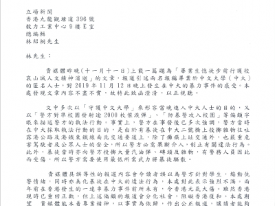警方昨日(12日)就《立场新闻》周四(11日)晚发布一篇题为「毕业生忆徒步前行护校哀山城人文精神消逝」的报道,去信该媒体总编辑,指文章引述两名报称毕业于中文大学的匿名人士对前年11月12日晚中大的暴力事件,内容不尽不实,令读者误以为警方针对学生,煸动仇警情绪,亦美化暴徒在中大的违法行为,警方对此表示强烈不满。 警方在信中指出,文中多次以「守护中文大学」来形容当晚进入中大人士的目的,又以「警方对准校园射逾2000枚催泪弹」「防暴警攻入校园」等偏颇字眼来描述警方的执法。警方重申已多次强调当日执法目的,是由于有暴徒在中大二号桥上,往吐露港公路及港铁东铁线南北交通要道上投掷杂物,所以警方必须介入制止违法行为。警方又指,当时有暴徒向警方投掷大量汽油弹、砖头及杂物,有警员受伤,所以要用最低武力将暴徒驱散。 警方批评《立场新闻》有关偏颇的报道会分化社会,阻却香港复和,促请本着专业精神,作出公正报道。