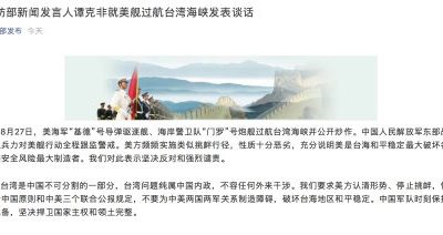 据“国防部发布”微信公众号:8月27日,美海军“基德”号导弹驱逐舰、海岸警卫队“门罗”号炮舰过航台湾海峡并公开炒作。中国人民解放军东部战区组织兵力对美舰行动全程跟监警戒。美方频频实施类似挑衅行径,性质十分恶劣,充分说明美是台海和平稳定最大破坏者、台海安全风险最大制造者。我们对此表示坚决反对和强烈谴责。 台湾是中国不可分割的一部分,台湾问题纯属中国内政,不容任何外来干涉。我们要求美方认清形势、停止挑衅,恪守一个中国原则和中美三个联合公报规定,不要为中美两国两军关系制造障碍,破坏台海地区和平稳定。中国军队时刻保持高度戒备,坚决捍卫国家主权和领土完整。