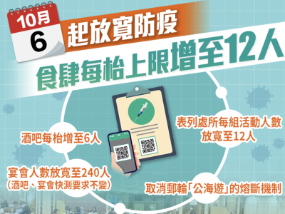 政府早前在记者会上宣布,由今日(10月6日)起放宽部分防疫措施,餐饮处所由每台8人放宽至12人;表列处所每组活动人数放宽至12人;酒吧酒馆每台人数由4人增至6人;宴会人数由120人放宽至240人,但仍然维持需要快测的要求。此外,取消就邮轮「公海游」的熔断机制。 新安排下,餐饮处所每台人数上限由此前的8人,从今日起增至12人,并维持宴会防疫规定,即是13人或以上有共同目的下,一同于餐饮处所用膳,便需于进场时出示快速测试阴性证明。餐饮处所宴会人数上限由现时120人,倍增至240人。酒吧或酒馆、夜店及夜总会的每台人数上限由现时4人,放宽至6人,但营业时间不变,亦继续禁止现场表演,入场前也须出示快速测试阴性证明。健身中心、游乐场所、美容院、按摩院等表列处所,每组活动人数上限亦由8人放宽至12人。 至于社会上有声音要求,入境检疫措施由现时的「0+3」,进一步放宽为「0+0」,医务卫生局副局长李夏茵早前称,「0+3」实施只有短短几天,数据尚未足以显示政策是否需再调整,「0+0」安排未有时间表。对于餐饮、酒吧等营业时间为何不放宽,她称希望措施一步步放宽,而不是「一篮子全部放宽」。 政府表示,会密切观察疫情整体发展,在未来每个14天周期,检视放宽社交距离措施的空间,务求在疫情持续稳定的情况下,让市民生活进一步复常。