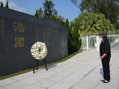 公务员事务局长杨何蓓茵今日(4日)在社交网站表示,她在重阳节前夕,到浩园悼念因公殉职的人员,献上鲜花,致以最崇高的敬意和哀思,对他们的无私奉献再一次奉上无言的感谢。杨何蓓茵指,长埋浩园的75位殉职人员,来自不同的部门和职级,他们都克尽己职,执行职务时不畏缩、完成使命,彰显香港精神,是公仆的阶模,历史会永远记念他们为香港的付出。 另外,杨何蓓茵亦到景仰园向菲律宾马尼拉人质事件的死难者献花致意。